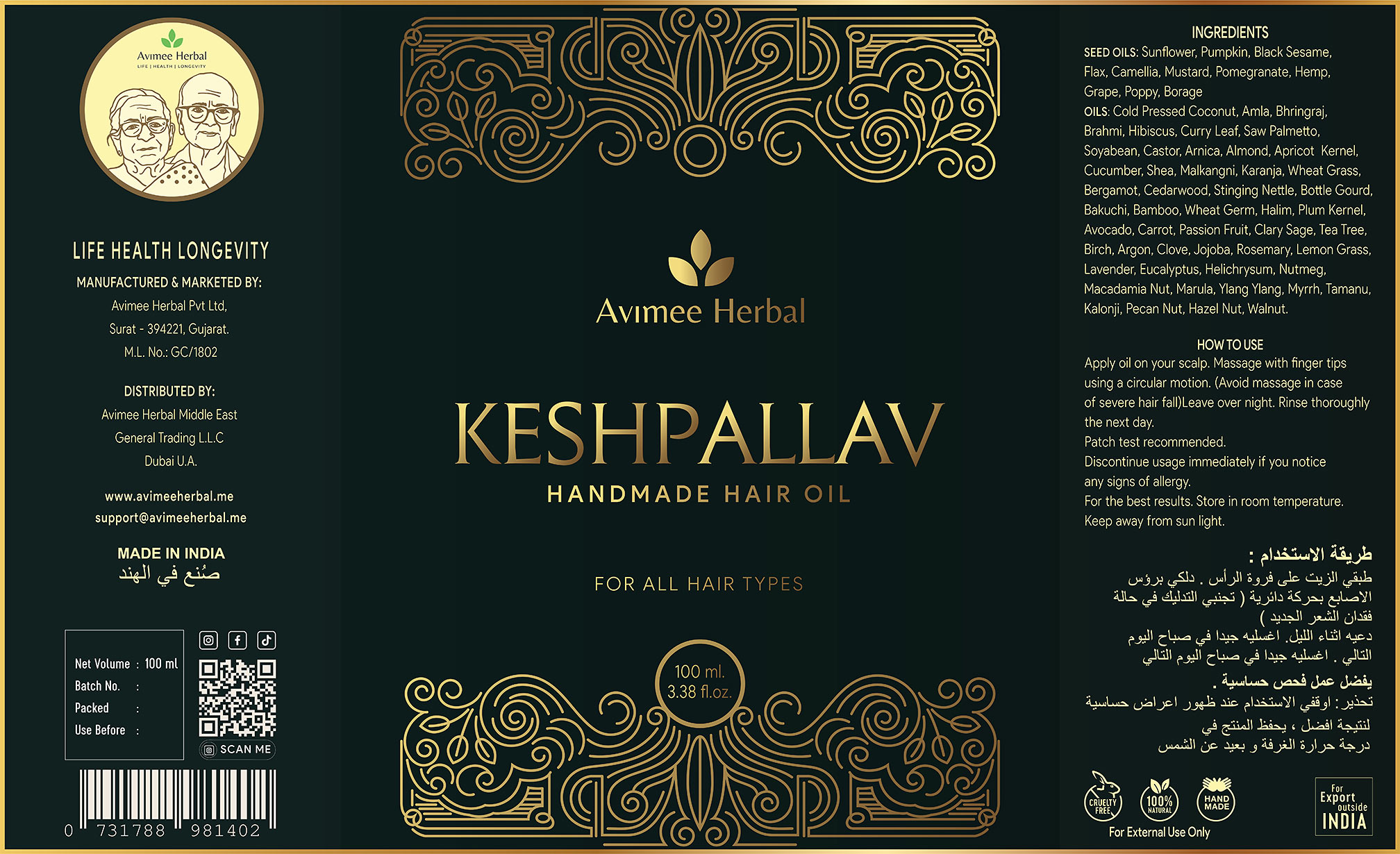Product labels were designed for Avimee Herbal’s Keshpallav Handmaid Hair Oil, blending natural aesthetics with a refined, professional presentation. The design ensures brand cohesion while clearly communicating key product details, creating a visually appealing and trustworthy representation that resonates with consumers.